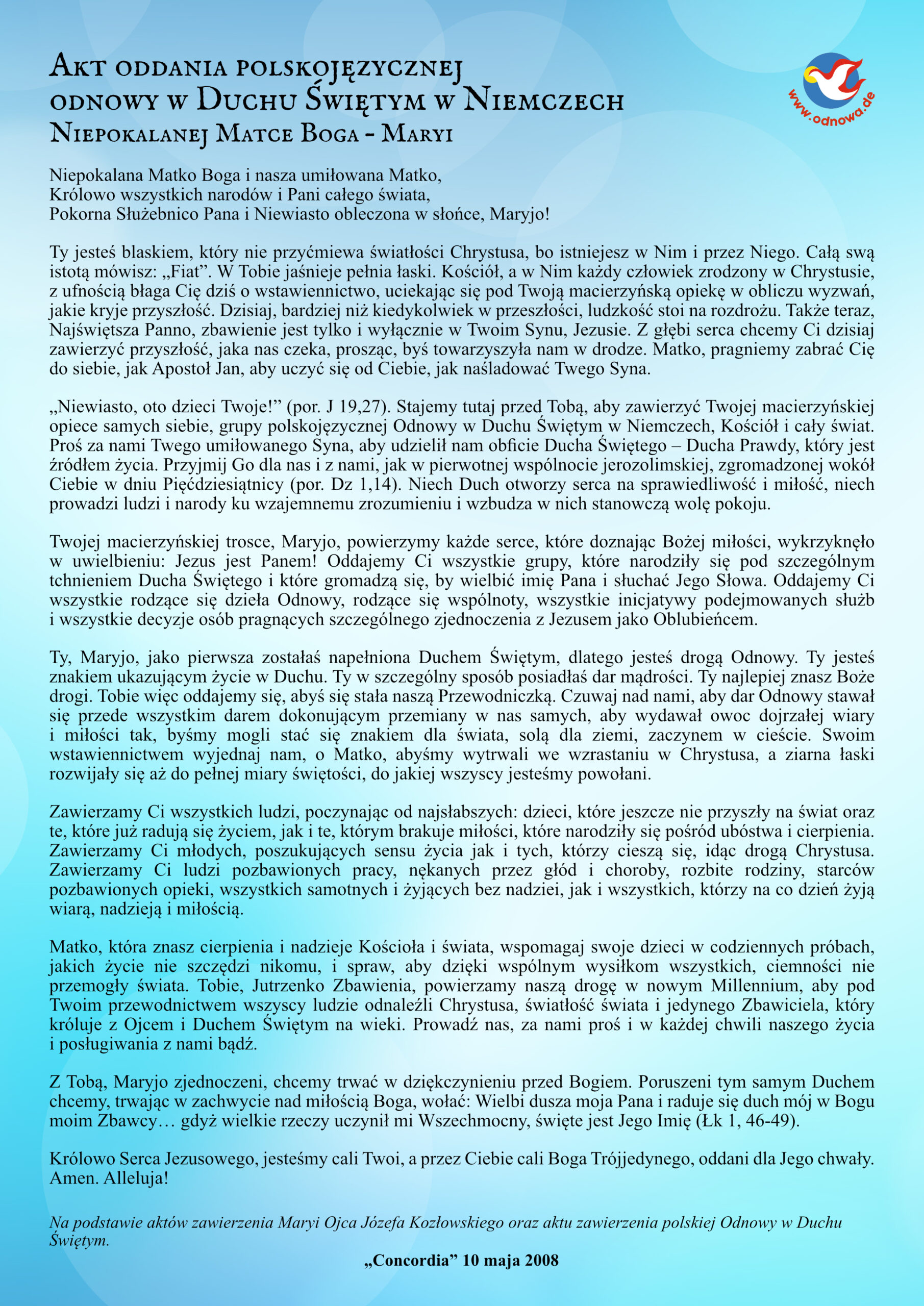 Na podstawie aktów zawierzenia Maryi Ojca Józefa Kozłowskiego oraz aktu zawierzenia polskiej Odnowy w Duchu Świętym.